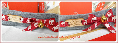 Con del feltro grigio spesso, ho creato due cestini e ne ho decorato il bordo esterno con un nastro mooolto natalizio ^_^, una tag in legno (una con la scritta Christmas ed una con la scritta Let it snow), un fiocco e un bubbolo dorato.
