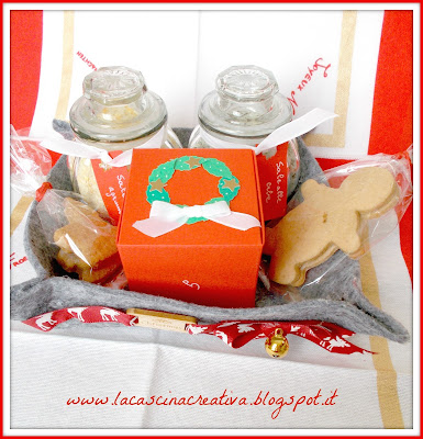 I cestini contenevano la scatolina con i biscotti, una bustina con due omini di panpepato ed una con due cavallini a dondolo (immancabili quest'anno ^_^) e due vasetti di sali aromatizzati.