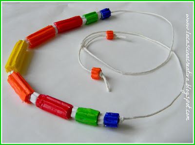 Visto che la voglia di colore è tanta e che la festa della mamma è vicina, vi do un altro suggerimento per un'altra collana fatta utilizzando il cartoncino ondulato che si trova nelle confezioni di fette biscottate, di cracker ecc. Un lavoro perfetto per i bambini!