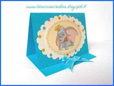 ...e un biglietto speciale creato utilizzando un piccolo centrino di carta -in origine serve per presentare piccoli dolci e pasticcini- al quale ho incollato sul retro un cuore di cartoncino azzurro per creare il contrasto.